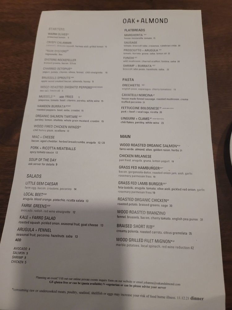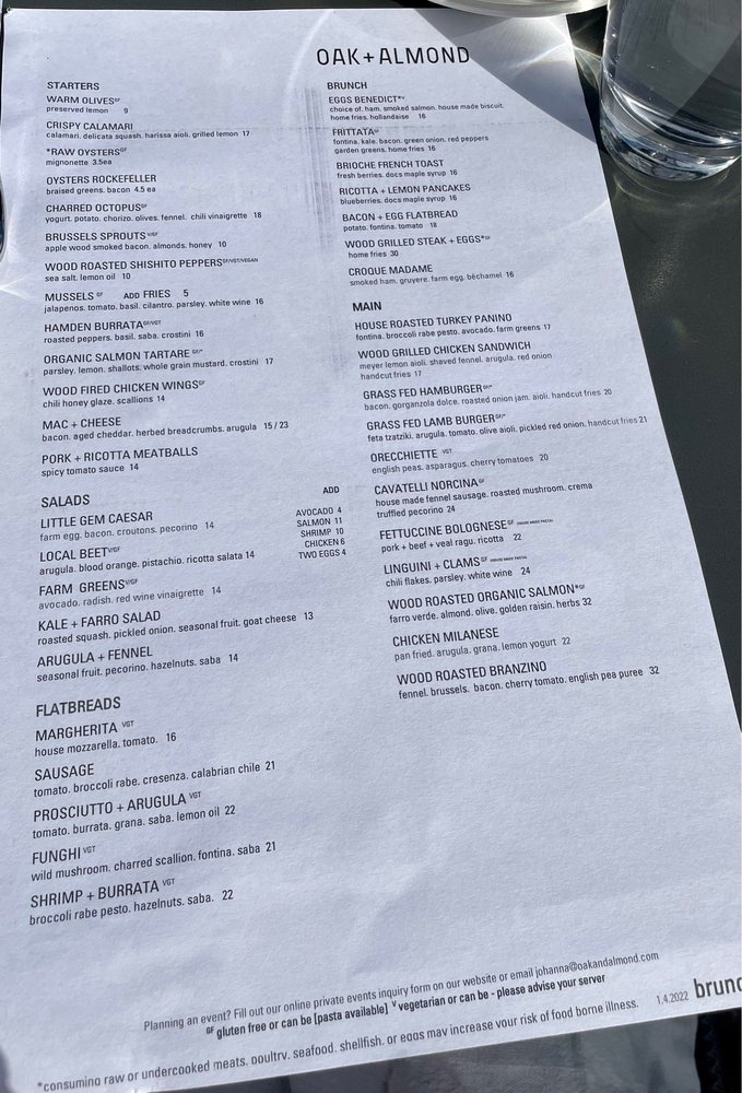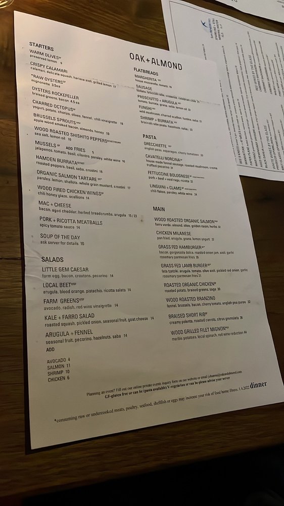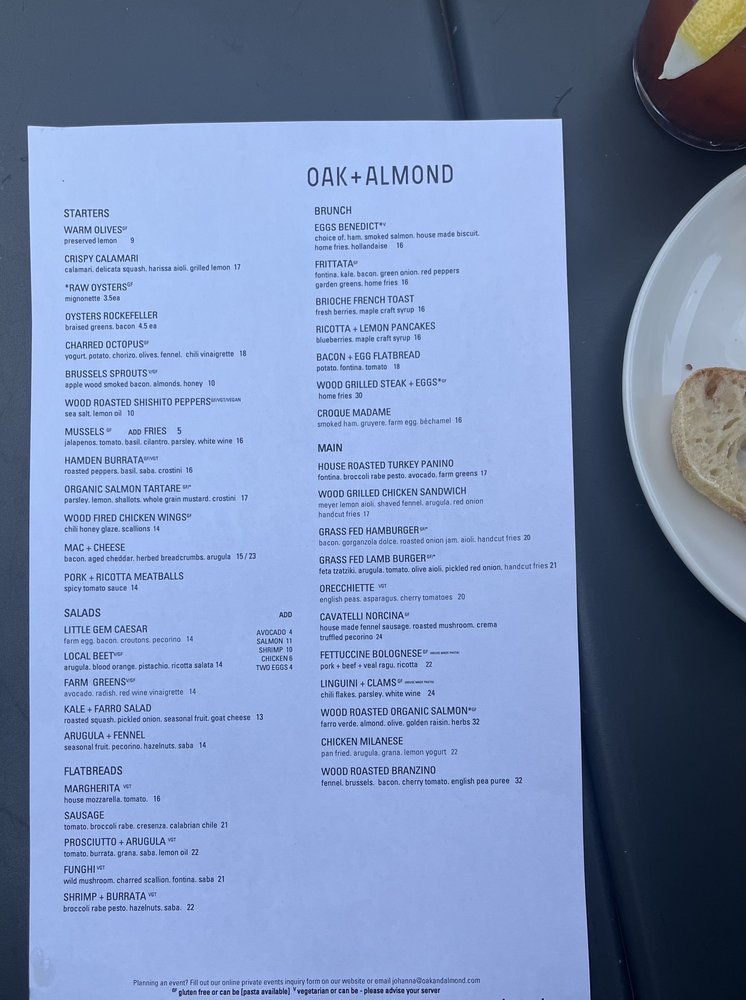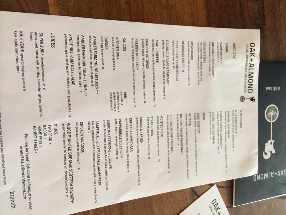 Oak + Almond Menu (Update 2025)